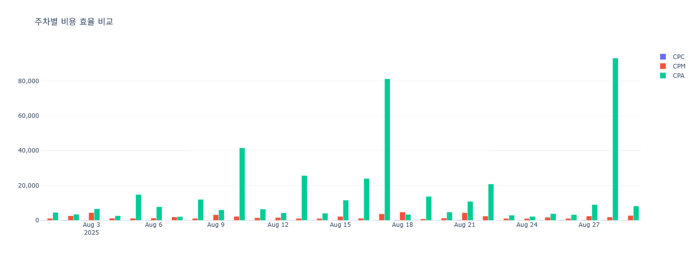 fig3.update_layout(barmode="group", title="주차별 비용 효율 비교", template="plotly_white")
