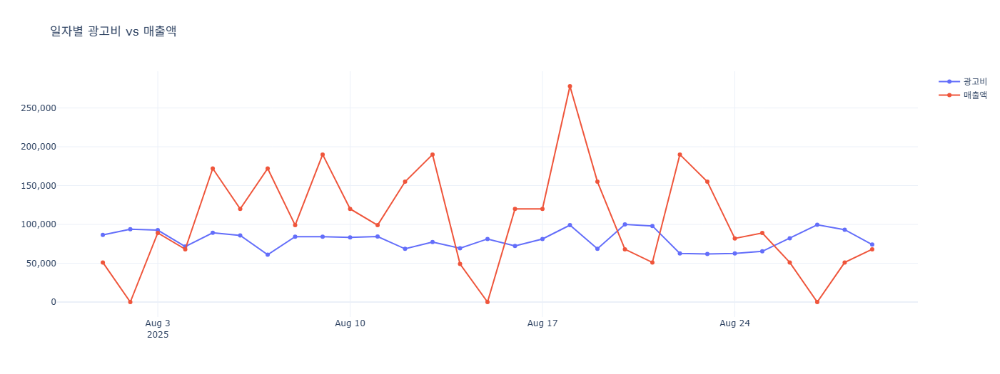 fig1.update_layout(title="일자별 광고비 vs 매출액", template="plotly_white")