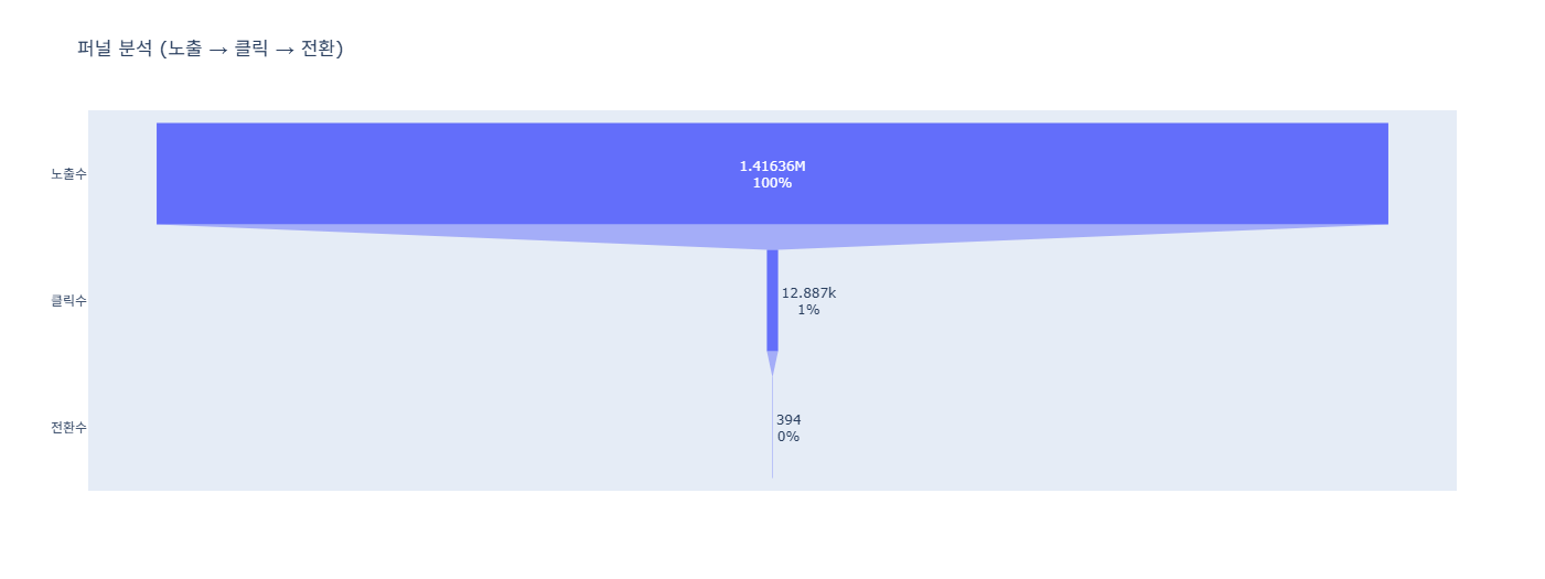 fig2.update_layout(title="퍼널 분석 (노출 → 클릭 → 전환)")