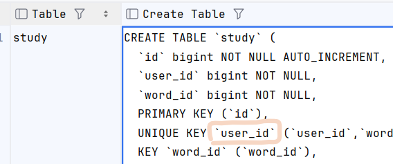 초기에는 단순히 user_id와 word_id만으로 유니크 제약 조건을 설정했으나