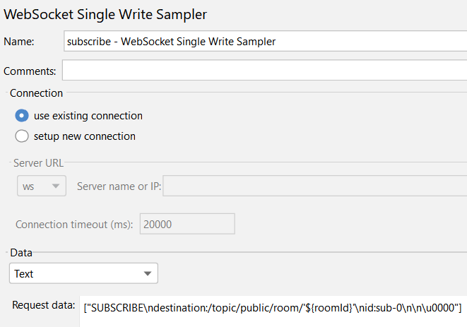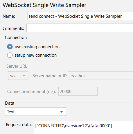“WebSocket Single Write Sampler”로 메시지를 보내기 때문에 use existing connection 적용