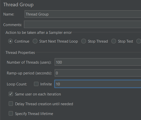 Number of Threads = 1000 이고 Loop Count = 10 일 때, 1000명의 유저는 동일한 작업을 10번 수행하게 된다.