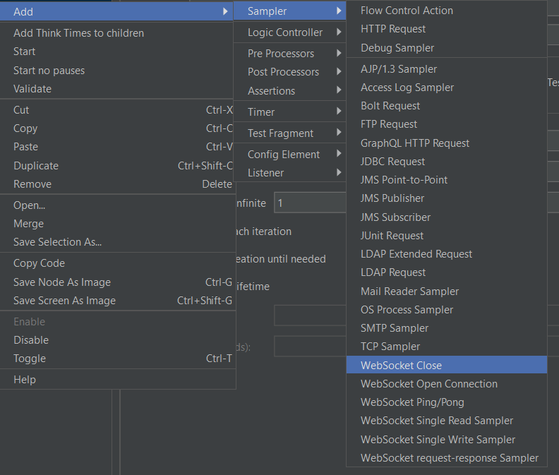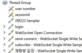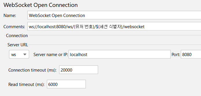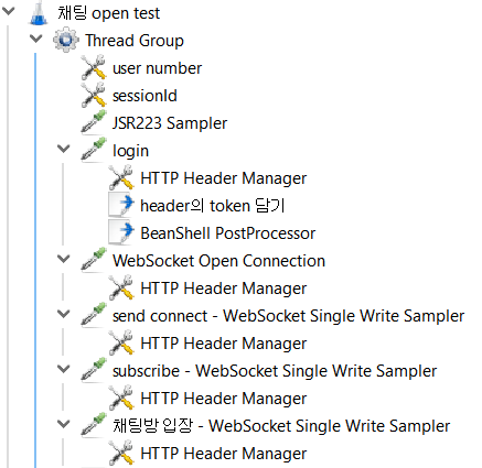 각각 WebSocket Open Connection 및 WebSocket Close Sampler를 사용하면 될 것 같다.