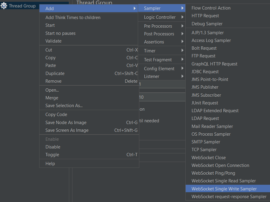 Thread Group > Add > Sampler > WebSocket Single Write Sampler