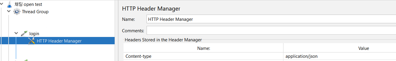 HTTP Header Manager에 Name = Content-type, Value = application/json를 추가한다.