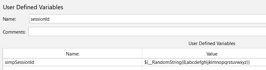 Name = sessionId, Value = ${__RandomString(8,abcdefghijklmnopqrstuvwxyz)}
