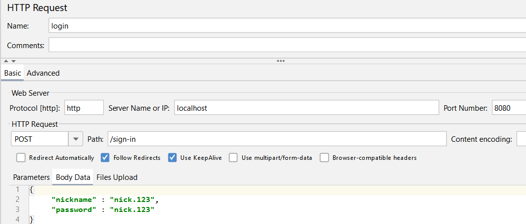Body Data에 json형식으로 nickname과 password를 작성한다.