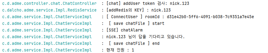 사용자가 채팅방에 접속했을 때 띄워지는 log가 출력되었다.
