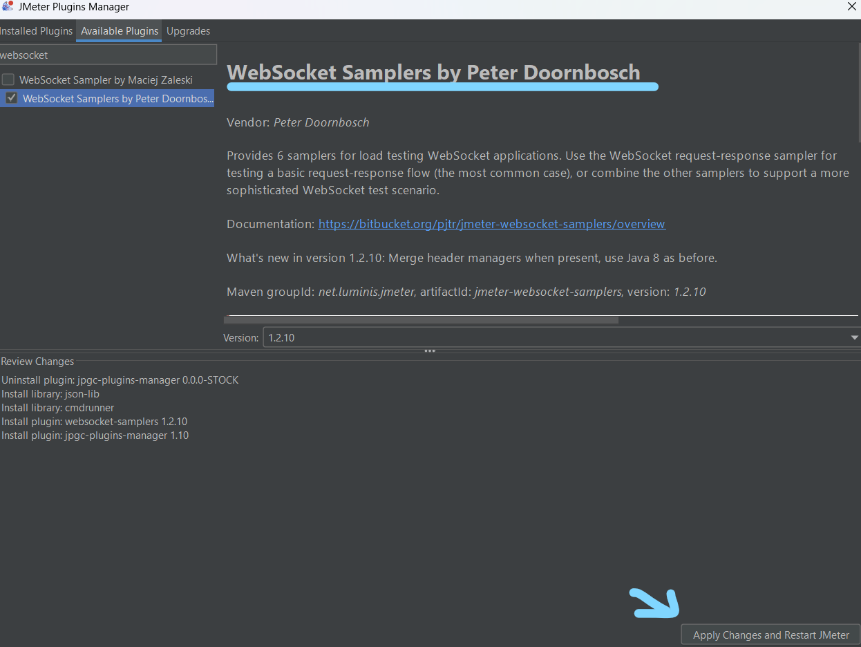 options 탭 → Plugins Manager → Available Plugins 탭 클릭 → WebSocket Sampler by Peter Doornbosch를 체크