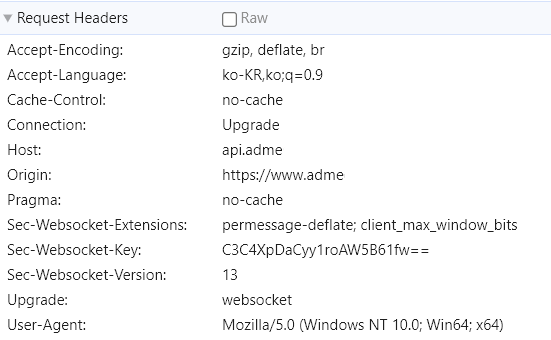 웹소켓 연결 요청에는 Connection: Upgrade와 Upgrade: websocket 헤더를 통해 웹소켓 요청임을 표시한다.
