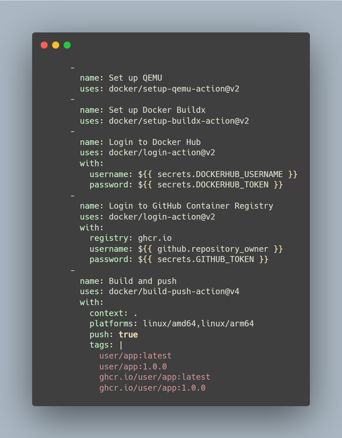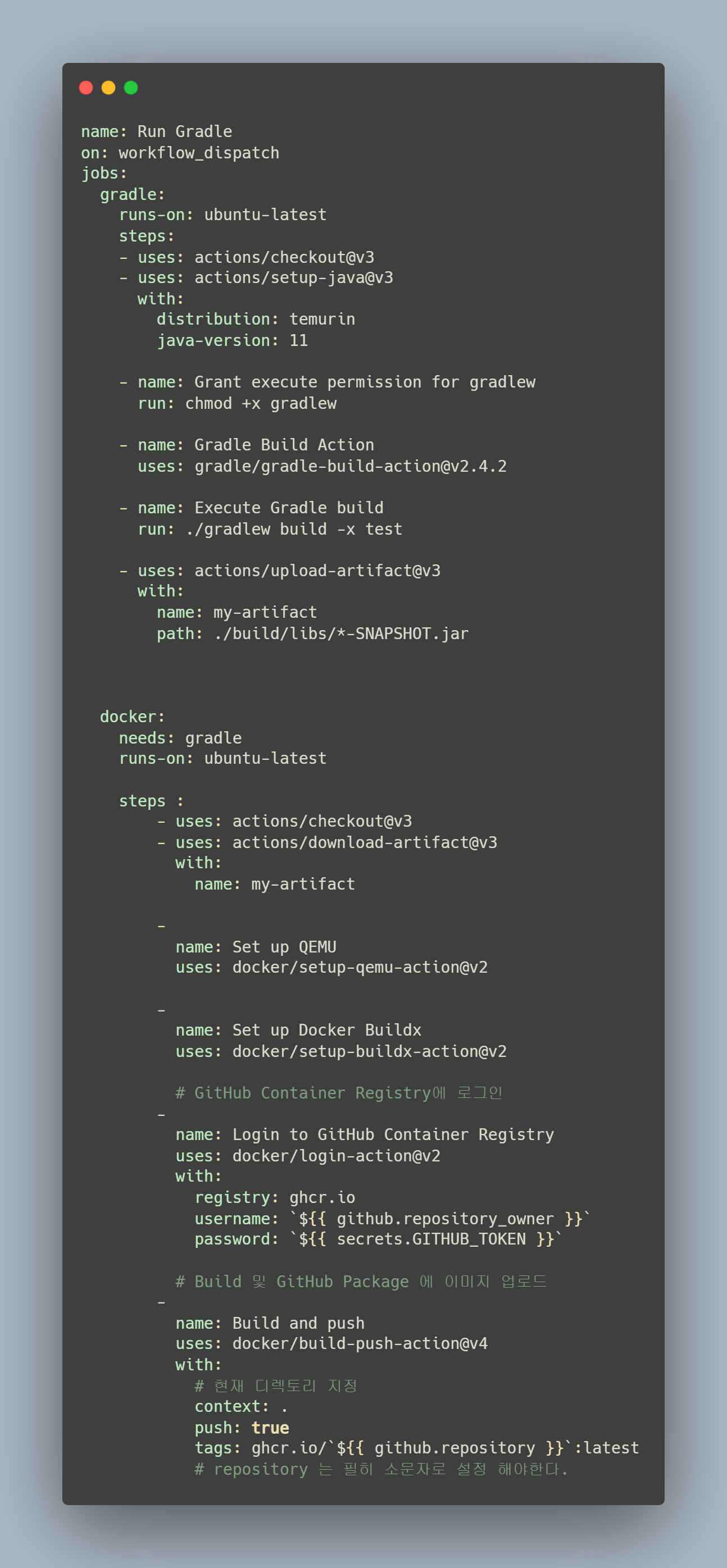 registry: ghcr.io는 GitHub Container Registry를 사용하겠다는 의미이를 통해 Docker 이미지를 GitHub Container Registry에 푸시하거나, 해당 레지스트리에서 이미지를 가져올 수 있다.