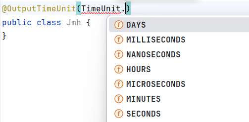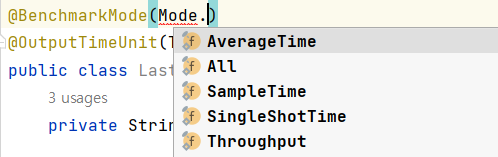 ex. @BenchmarkMode(Mode.AverageTime)으로 설정하면 평균 실행 시간이 결과로 나타난다.