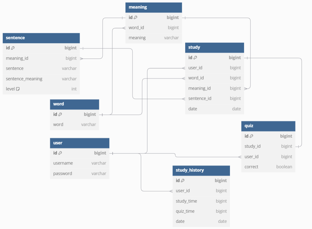 사용자가 학습과 퀴즈 풀이를 진행한 시간을 저장하기 위해 StudyHistory 테이블을 생성했다.