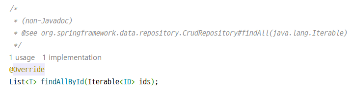 JpaRepository 인터페이스를 확인해보면 find 관련 메서드는 CrudRepository를 참고하도록 되어 있고