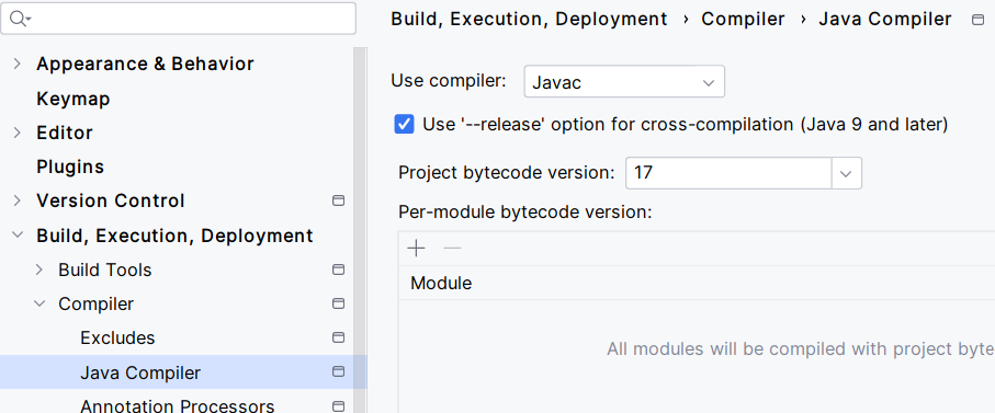 Preferences/Settings → Build, Execution, Deployment → Compiler → Java Compiler