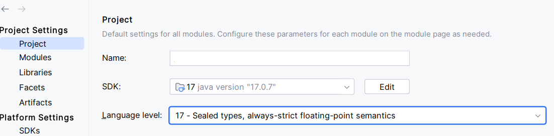 File → Project Structure로 이동. 프로젝트 SDK의 버전을 확인후 Java 17이상으로 설정한다.