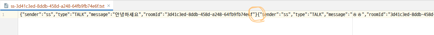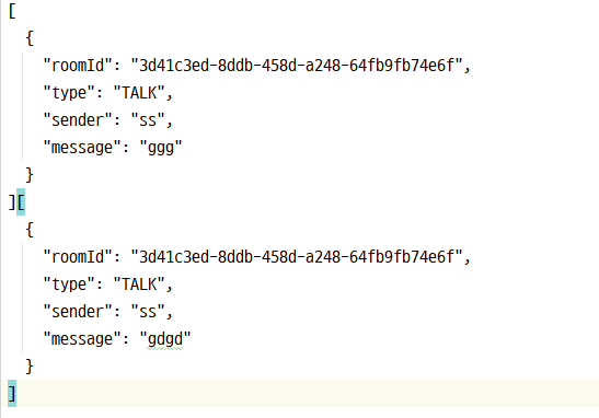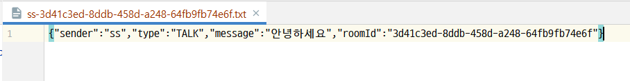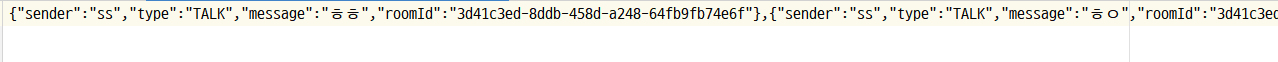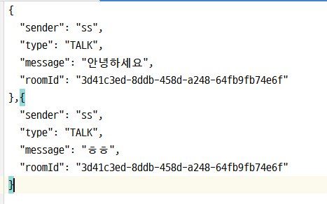 {“sender”:”ss”,”type”:”TALK”,”message”:”안녕하세요”,”roomId”:”uuid”}