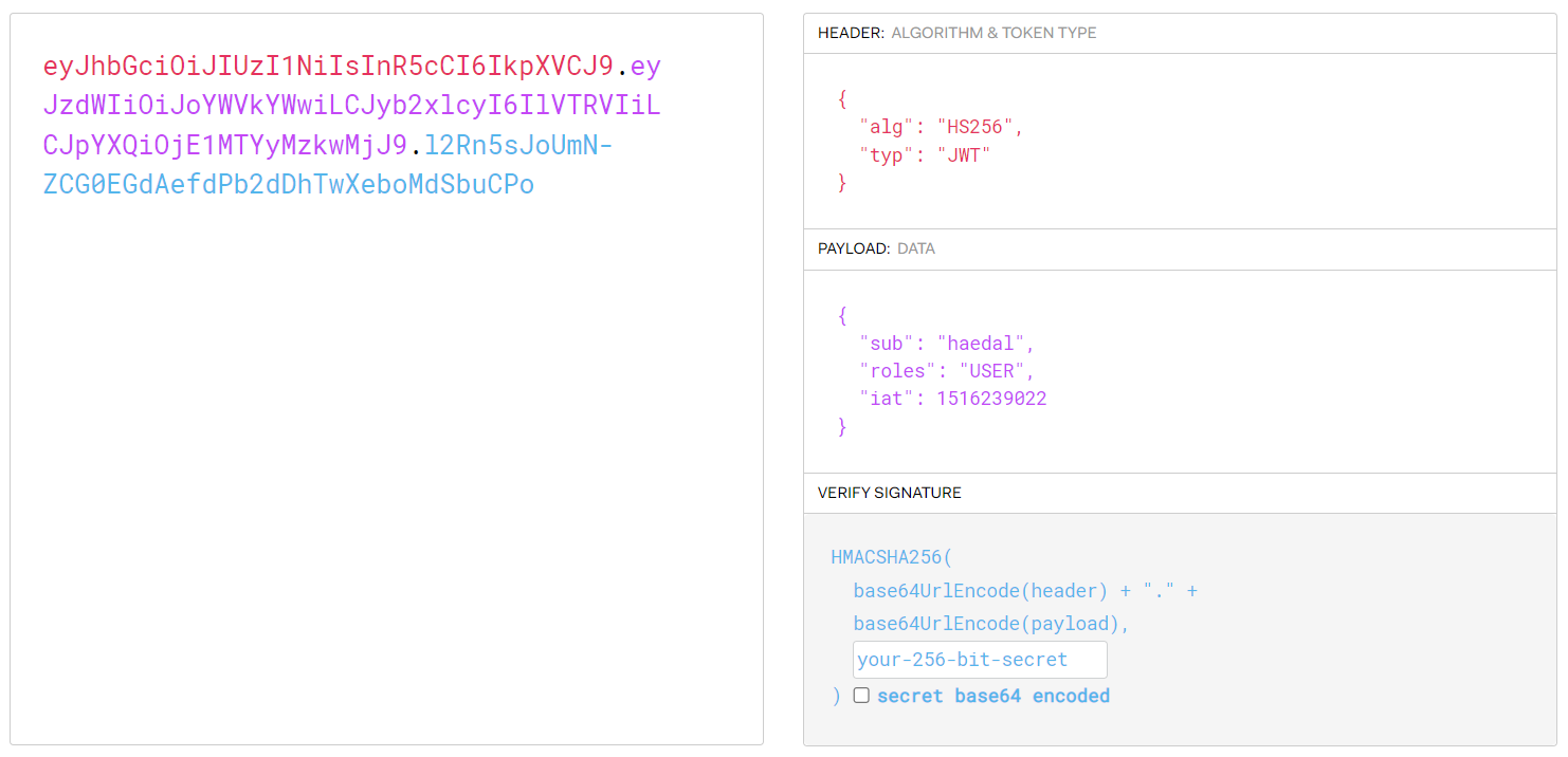 getClaims(token) : header={alg=HS256},body={sub=haedal, roles=USER, iat=1516239022, exp=1234567890},signature=ajslkdfjaldkfjaDSLFieo
