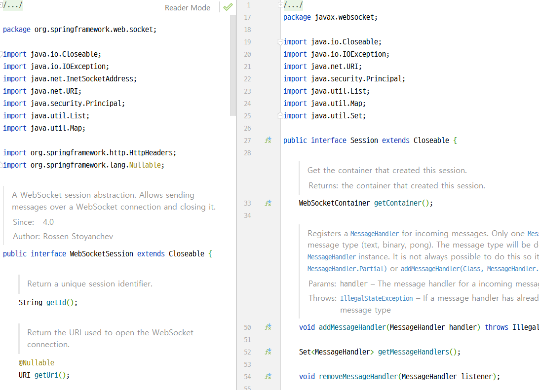 WebSocketSession과 Session 모두 Closeable을 상속받고 있다.