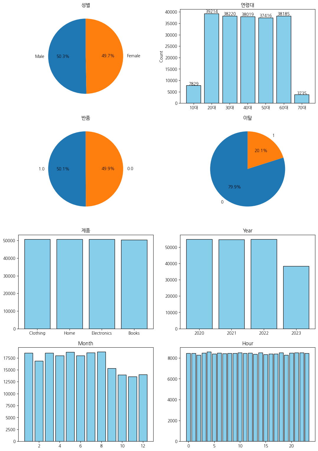 성별, 연령대, 반품, 이탈, 제품, 날짜를 시각화 했으며 연령을 연령대로 변환해 진행했다.