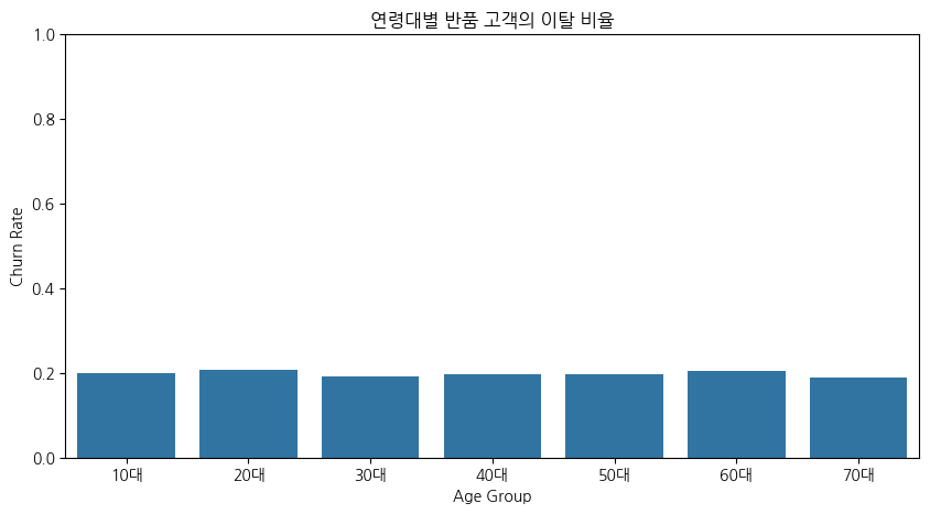 반품 경험이 있는 고객의 경우 연령대와 관계없이 일정 수준의 이탈 비율을 보이는 경향이 있다.