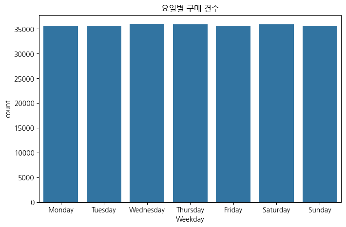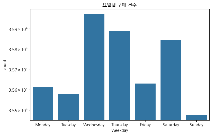 수, 목, 토요일 순으로 구매 건수가 높고 일요일이 가장 낮다.