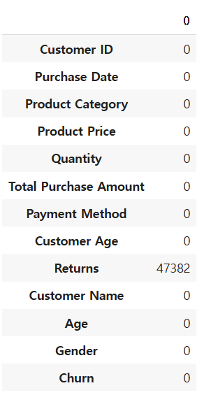 Returns 열에만 Nan값이 있어 개수를 확인했다. 총 47382로 전체 데이터의 약 19%를 차지한다.