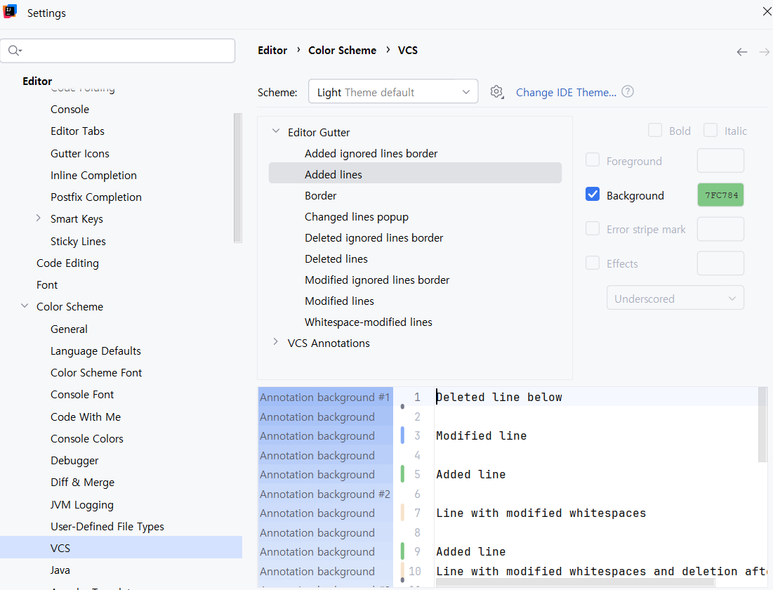 Editor → Color Scheme → VCS